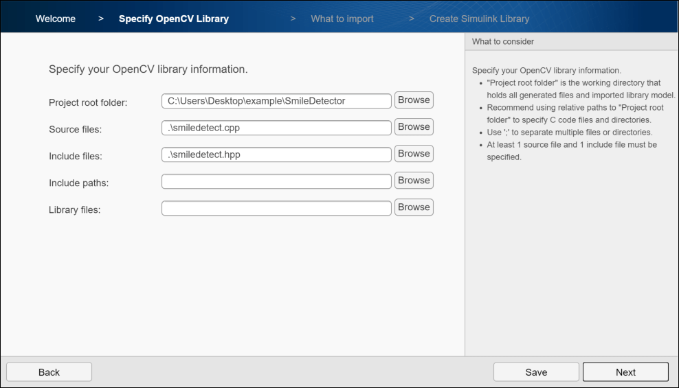 2. In Specify OpenCV Library, specify these file locations, and then click Next.