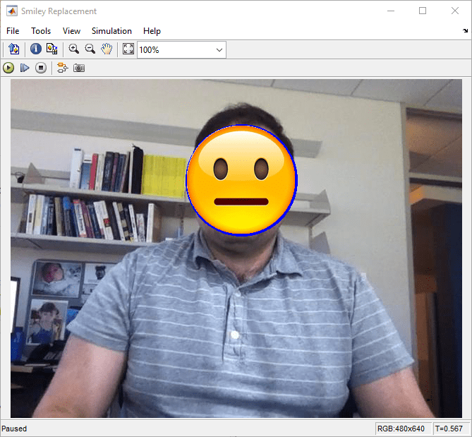On the Simulink Toolstrip, in the Simulation tab, click on Run to simulate the model. After the simulation is complete, the Video Viewer blocks display the face detected. The model overlays an emoji on the face. The emoji represents the intensity of the smile.