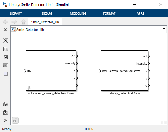 A Simulink library Smile_Detector_Lib is created from your OpenCV code into the project root folder. The library contains a subsystem and a C Caller block. You can use any of these blocks for model simulation. In this example, the subsystem subsystem_slwrap_detectAndDraw is used.