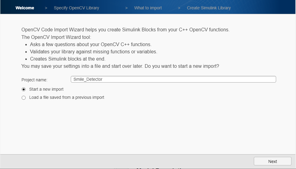 1. To start the OpenCV Importer app, click Apps on the MATLAB Toolstrip. In the Welcome page, specify the Project name as Smile_Detector. Make sure that the project name does not contain any spaces. Click Next.