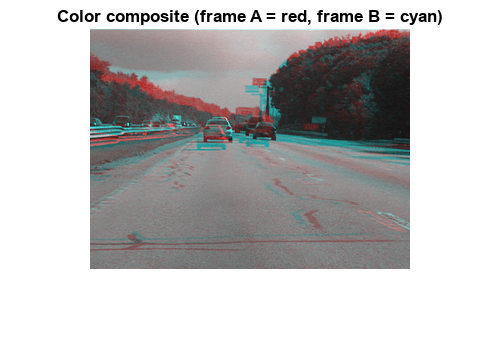 figure imshowpair(imgA,imgB,ColorChannels="red-cyan"); title("Color composite (frame A = red,frame B = cyan)");