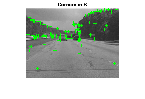 figure imshow(imgB) hold on plot(pointsB) title("Corners in B")