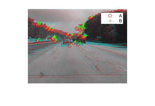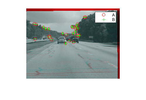 figure showMatchedFeatures(imgA,imgB,pointsA,pointsB) legend("A","B")