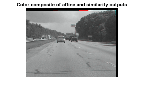 tformSRT = simtform2d(scale,thetad,translation); imgBold = imwarp(imgB,tform,OutputView=imref2d(size(imgB))); imgBsRt = imwarp(imgB,tformSRT,OutputView=imref2d(size(imgB))); figure(2) clf imshowpair(imgBold,imgBsRt,"ColorChannels","red-cyan"),axis image; title("Color composite of affine and similarity outputs");