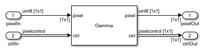The Gamma Corrector block accepts the pixel stream, as well as a bus containing five synchronization signals, from the Frame To Pixels block. It passes the same set of signals to the downstream Pixels To Frame block. Such signal bundle and maintenance are necessary for pixel-stream processing.