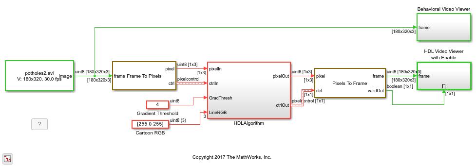 The part of the model between the Frame to Pixels and Pixels to Frame blocks can be implemented on an FPGA. The HDLAlgorithm subsystem includes all elements of the bilateral filter, edge detection, and overlay.
