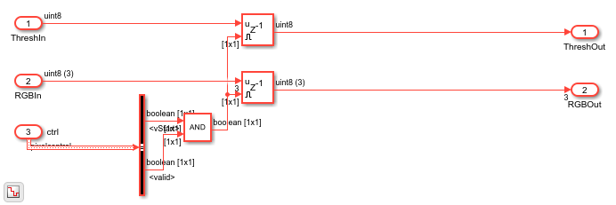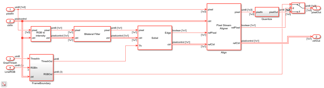 In addition to the pixel and control signals, two parameters enter the HDLAlgorithm subsystem: the gradient threshold and the line RGB triple for the overlay color. The FrameBoundary subsystem provides run-time control of the threshold and the line color. However, to avoid an output frame with a mix of colors or thresholds, the subsystem registers the parameters only at the start of each frame.