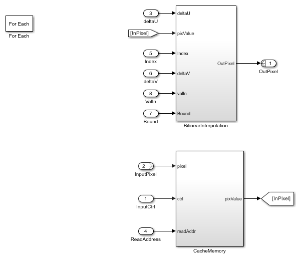 The Interpolation subsystem is a For Each block, which replicates its operation depending on the dimensions of the input pixel. For example, if the input is an RGB image, then the input pixel dimensions are 1-by-3, and the model includes three instances of this operation. Because the model uses a For Each block, it supports RGB or grayscale input. The operation inside the Interpolation subsystem comprises two subsystems: BilinearInterpolation and CacheMemory.