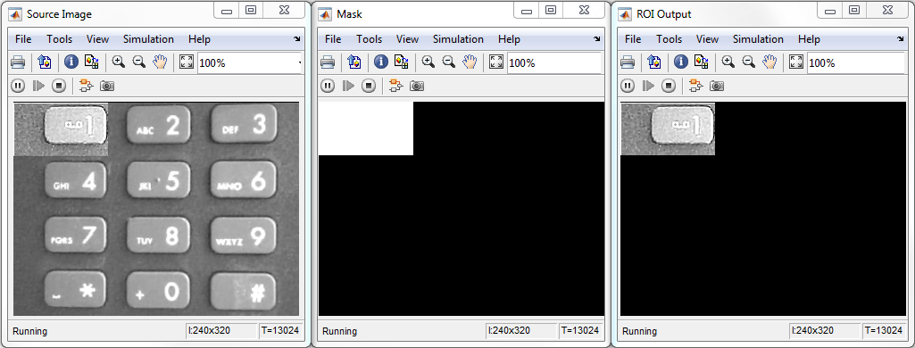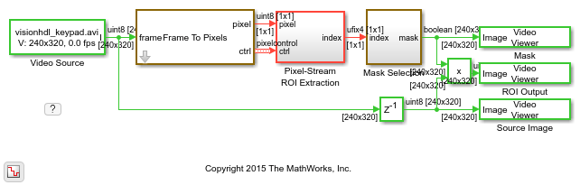 In this example, the Pixel-Stream ROI extraction subsystem calculates the mean intensity value over 12 predefined ROIs in a frame and outputs the index number (1-12) that corresponds to the most illuminated ROI. The downstream Mask Selection subsystem accepts this index number and outputs the associated binary mask image. The binary mask image is applied to the source video to display only the most illuminated ROI, and mask off the other 11 ROIs. The Delay block at the top level of the model is used to match the latency introduced by pixel-stream processing.