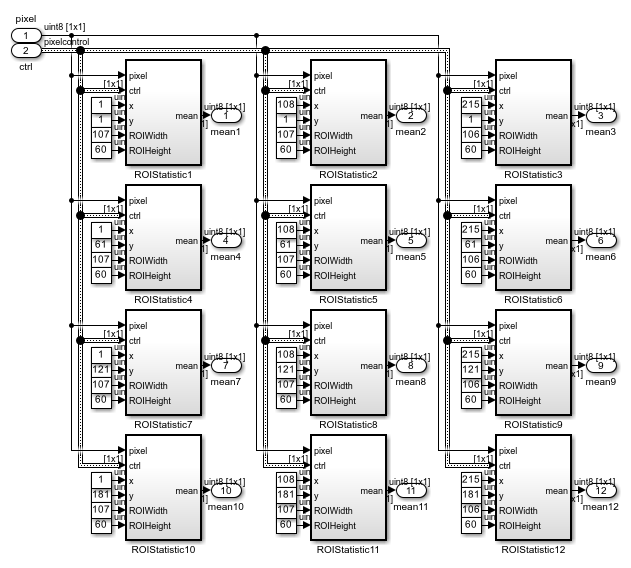 The Multi-Zone Metering subsystem contains 12 identical ROIStatistic subsystems. Each instance of ROIStatistic calculates the mean intensity value over one ROI. All of the 12 ROIStatistic subsystems take pixel and ctrl as their first two inputs. The remaining four inputs specify which ROI this subsystem works on and they are different from one subsystem to another. For example, the ROIStaticstic1 subsystem focuses on ROI number 1 by accepting the (x,y) coordinate of the top left pixel (1,1), ROI width of 107, and height 60. Similarly, the ROIStaticstic12 subsystem focuses on ROI number 12, whose (x,y) coordinate of the top left pixel is (215,181), and whose width and height are 106 and 60, respectively.