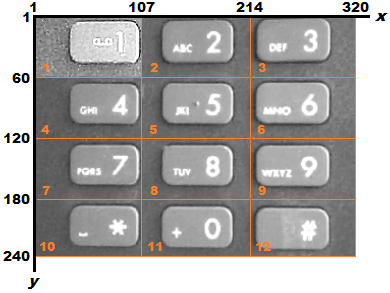 The video format is 240p. Each frame consists of 240 lines and 320 pixels per line. In this example, video frames are divided into 12 non-overlapping rectangular ROIs, denoted as ROI number 1 to 12, as shown in the diagram below. Each ROI includes one key of the input keypad image.