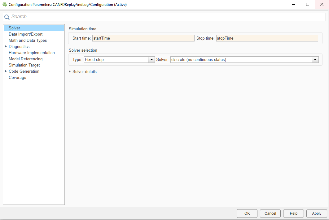 Configure the simulation start and stop time coherently with the initial and final timestamps of the messages timeseries. To this end, select the Modeling tab and click on Model Settings. Then, in the Configuration Parameters dialog box, set the simulation start and stop time using the variables startTime and stopTime previously defined. Click Apply and close the Configuration Parameters window.