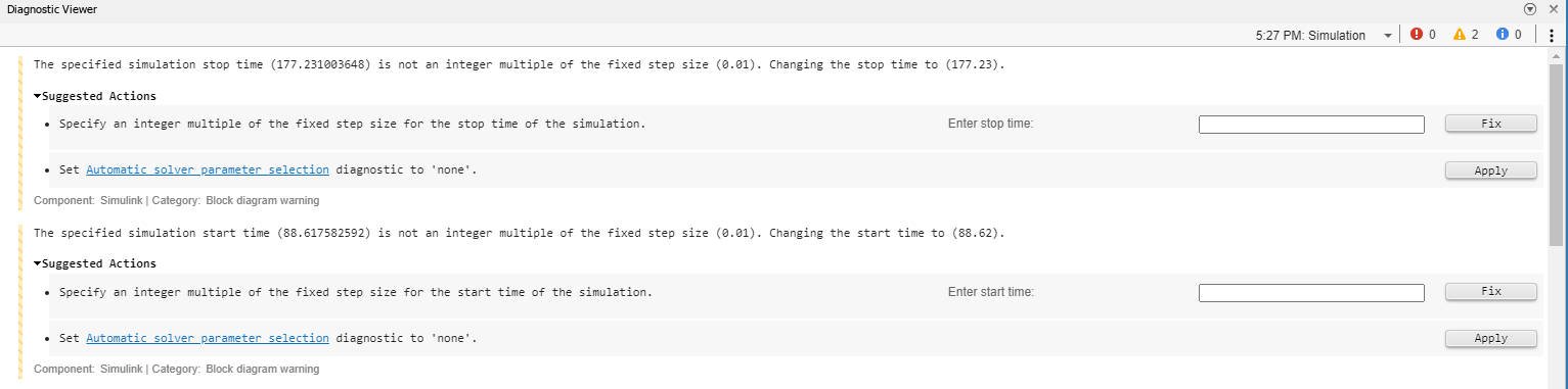 The model is configured to use a fixed-step solver, with a time step of 0.01 s. However, the values of the start and stop time, as obtained from the recorded timeseries, are not integer multiples of the simulation time step. The default behavior in Simulink is to round those values to make them compatible with the simulation time step; they could also be rounded in a MATLAB® script before simulation. More information about the automatic parameter selection of Simulink solvers can be found in the documentation page Choose a Solver (Simulink).