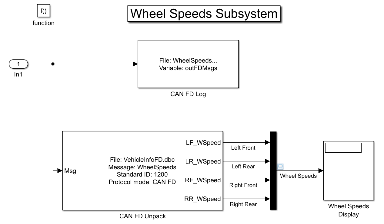 The Wheel Speeds subsystem unpacks the wheel speed information from the received CAN FD messages and plots them to a scope. The subsystem also logs the messages to a file.
