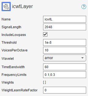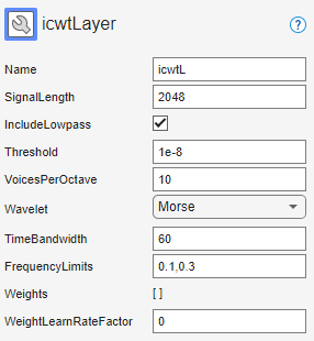 example, layer = icwtLayer(PropertyName=Value)layer = icwtLayer(SignalLengh=2048,VoicesPerOctave=14) creates