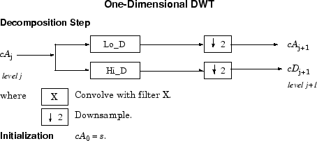 Given a signal s of length N, the DWT consists of log2N stages at most. Starting from s, the first step produces two sets of coefficients: approximation coefficients cA1, and detail coefficients cD1. These vectors are obtained by convolving s with the low-pass filter Lo_D for approximation, and with the high-pass filter Hi_D for detail, followed by dyadic decimation.