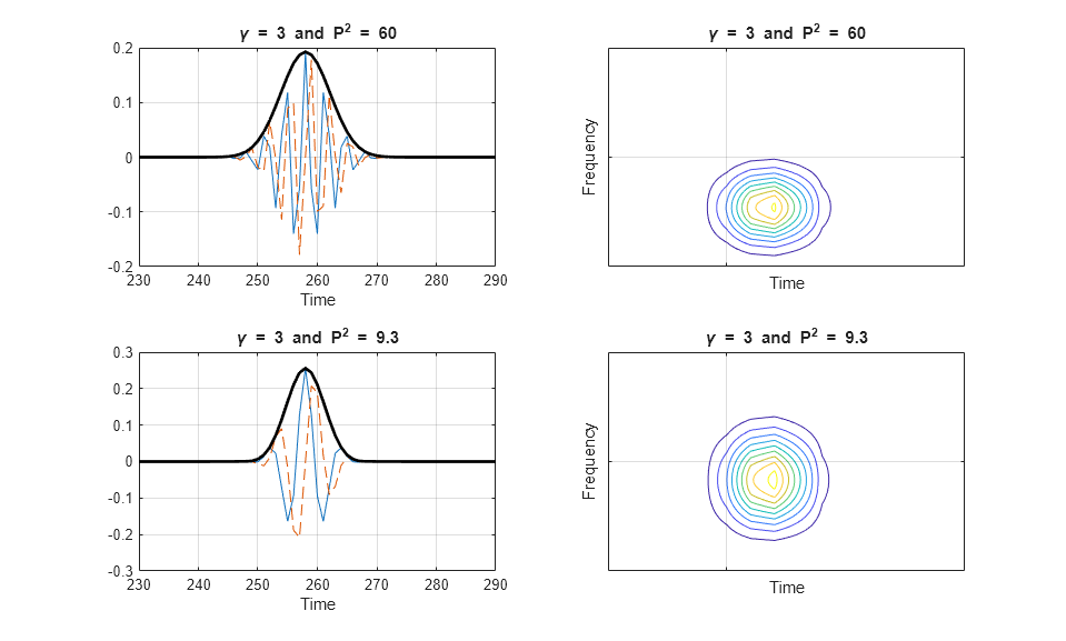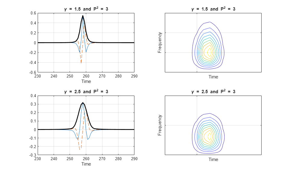 In the time-domain plots in the left column, the red line is the real part and the blue line is the imaginary part. The contour plots in the right column show how the parameters affect the spread in time and frequency.