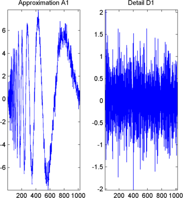 subplot(1,2,1), plot(A1); title('Approximation A1'); subplot(1,2,2), plot(D1); title('Detail D1');