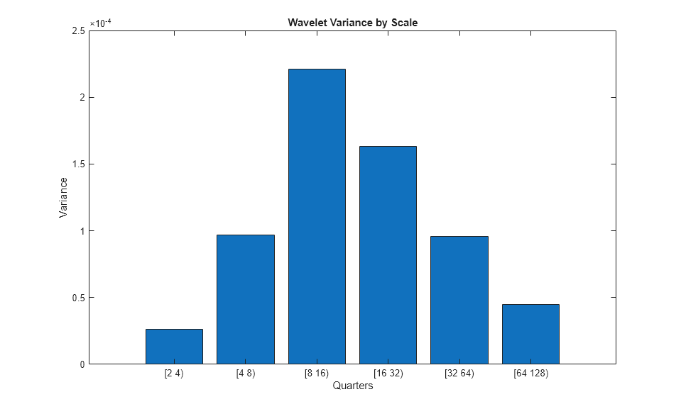 In vardata you have the variance for the aggregate GDP time series. In varwt you have the variance by scale for the MODWT. There are seven elements in varwt because you obtained the MODWT down to level six resulting in six wavelet coefficient variances and one scaling coefficient variance. Sum the variances by scale to see that the variance is preserved. Plot the wavelet variances by scale ignoring the scaling coefficient variance.