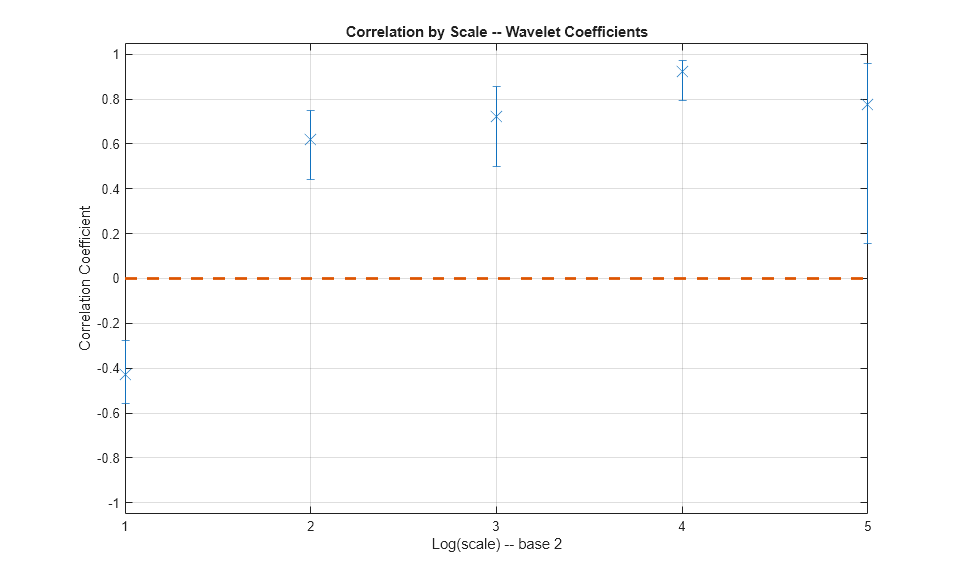 piwt = modwt(privateinvest,'fk8',5); pcwt = modwt(pc,'fk8',5); figure; modwtcorr(piwt,pcwt,'fk8')