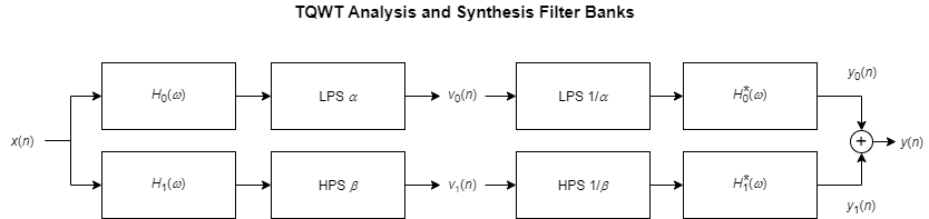 The TQWT algorithm is implemented as a two-channel filter bank. In the analysis direction, the lowpass subband v0(n) has a sample rate of α·fs, and the highpass subband v1(n) has a sample rate of β·fs. We say that the filter bank is oversampled by a factor of α + β.
