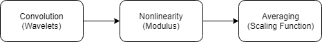 A wavelet scattering transform processes data in stages. The output of one stage becomes input for the next stage. Each stage consists of three operations.