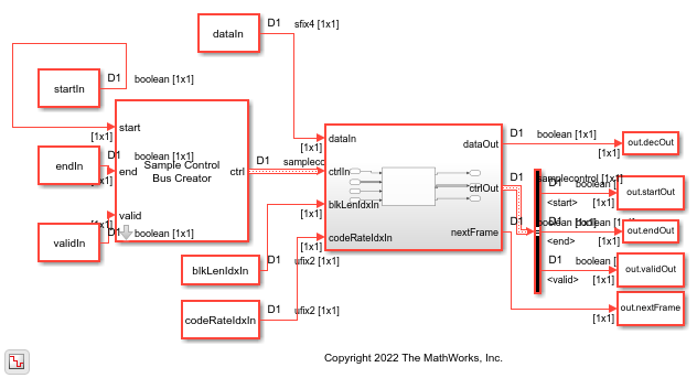Running the model imports the input signal variables dataIn, startIn, endIn, validIn, blkLenIdxIn, codeRateIdxIn, and simTime from the script. The model exports a stream of decoded output samples dataOut and a control bus containing startOut, endOut, and validOut signals to the MATLAB workspace.