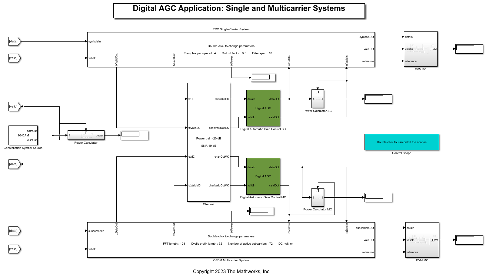 This figure shows the structure of the DigitalAGCSCMCSystems model. In the Constellation Symbol Source subsystem, you can set the constellation to BPSK, QPSK, 8-PSK, 16-APSK, 32-APSK, 16-QAM, 64-QAM, or 256-QAM to generate equally likely constellation symbols with unit average power. The Compute Power subsystem computes the power of the constellation symbols. The RRC Single-Carrier System treats the symbols as time-domain symbols and the OFDM Multicarrier System treats the symbols as frequency-domain subcarriers. The single-carrier and multicarrier systems generate a transmitter signal and display the computed signal power. The Channel subsystem adds white Gaussian noise and attenuate the transmit signal to generate a receive signal. The Digital Automatic Gain Control subsystem adjusts the input receiver signal power to a desired output power. The Power Calculator SC and Power Calculator MC subsystems compute the digital AGC output power from the single and multicarrier systems, respectively. The single and multicarrier systems recover the constellation symbols from the AGC output and align them with reference symbols. The EVM SC and EVM MC subsystems display the computed error vector magnitude (EVM) value for every 1000 symbols.