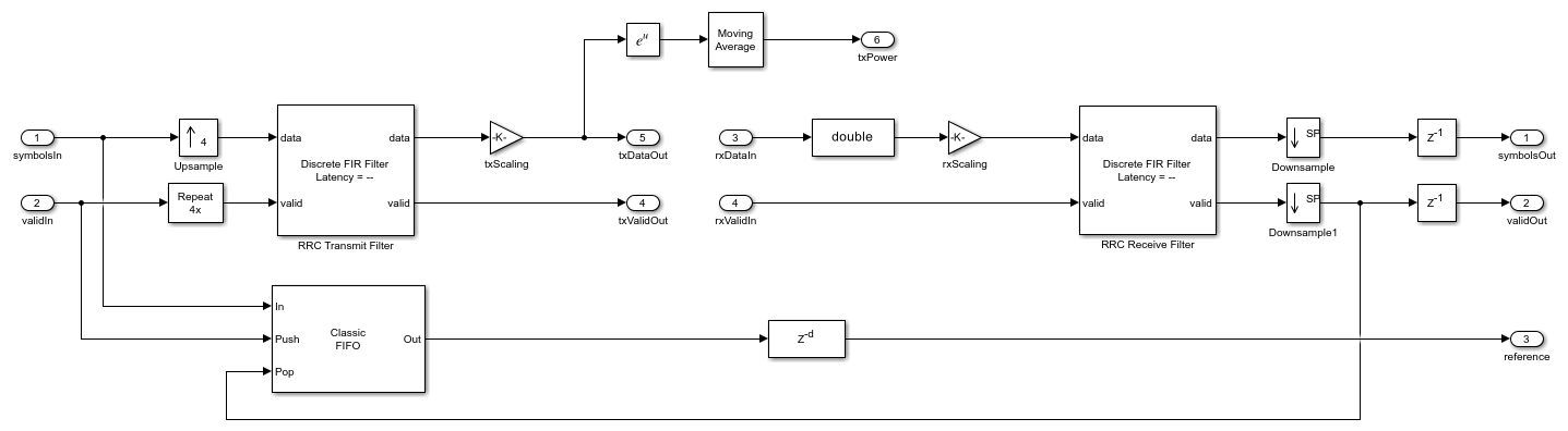 The RRC Transmit Filter and RRC Receive Filter are Discrete FIR Filter blocks with an RRC impulse response. You can set the RRC impulse response parameters in the RRC Single-Carrier System mask. The RRC Transmit Filter block pulse shapes the incoming symbols to generate a transmit signal. The transmit signal streams out for channel and digital AGC processing to generate a receive signal. The RRC Receive Filter block acts as a matched filter and filters the receive signal. The Downsample block downsamples the output of the RRC Receive Filter block to get the constellation symbols. The RRC Single-Carrier System is balanced with delays such that the samples after the downsample corresponds to the zero inter symbol interference (ISI) sample. The single-carrier system stores the reference symbols in a FIFO and align them with the output constellation symbols.