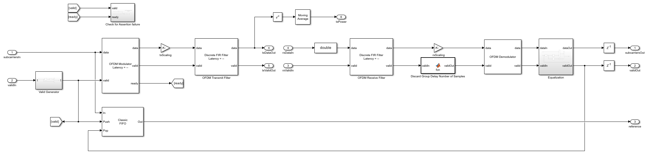 The Valid Generator subsystem generates a valid signal for a number of samples equal to the number of active subcarriers at an interval equal to the OFDM symbol length. The OFDM Modulator block modulates these subcarriers to generate OFDM symbols. The OFDM Transmit Filter is a Discrete FIR Filter block that filters the OFDM symbols to generate a transmit signal. The transmit signal streams out for channel and digital AGC processing to generate a receive signal. The OFDM Receive Filter is a Discrete FIR Filter block that filters the receive signal. The system discards the initial samples equal to the group delay of the two filters. The OFDM Demodulator block recovers the active subcarriers of each OFDM symbol. The system equalizes the active subcarriers with the combined frequency response of the transmit and receive filters. The group delay of the filters results in a time shift in the OFDM symbols, which is the same as the multiplication of complex exponential sinusoidal factors in the frequency domain. The system precomputes these sinusoidal factors and stored in an LUT. The system equalizes the OFDM demodulated samples obtained in frequency domain using the sinusoidal factors stored in the LUT. The system stores the reference subcarriers in a FIFO and align them with the equalized subcarriers.