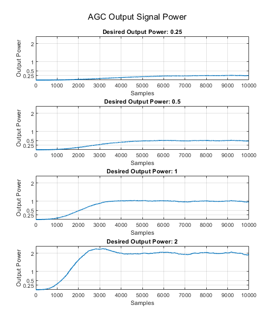 You can modify the AGC desired output power, step size, and channel power gain in the digitalAGCVaryParam script and verify the results.