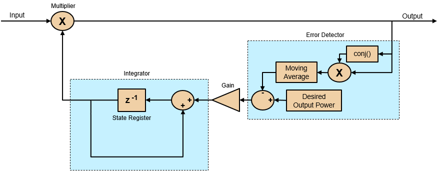 The Error Detector block detects errors by subtracting the computed output signal power from the desired output power. The Gain block multiplies the error with the step size of the AGC. The Integrator block continuously integrates the output of the Gain block. The Multiplier block multiplies the output of the integrator with the input to adjust the amplitude and generates the desired output power.