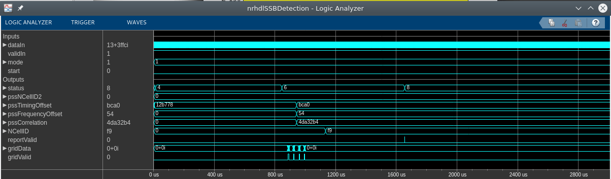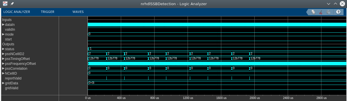 Use the Simulink Logic Analyzer to view the inputs and outputs to the SSB Detection subsystem. The detector looks for PSS symbols within a 20 ms time window, which begins after a pulse on the start input triggers the search operation. If no PSS symbols are found after 20 ms, the detector sets the status output to 2 - indicating that the search has failed. In this example, the detector finds all eight SSBs. The status output is set to 1 during the search, and a report is returned for each SSB by asserting the reportValid signal. The simulation only runs for 5 ms however if it is extended to run for more than 20 ms, then the status output is eventually set to 3 - indicating that the search has succeeded.
