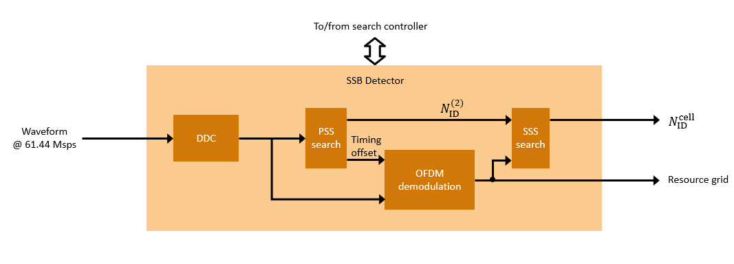 In search mode, the SSB detector searches for SSBs at the specified subcarrier spacing and frequency offset by correlating against each PSS sequence. The operation outputs a list of the detected SSBs, defined by a timing offset and PSS sequence ID. The correlation metrics and frequency offset for each SSB are reported. After a successful search operation the SSB detector automatically tracks the strongest detected PSS to maintain timing lock until a demodulation operation begins, and records the total timing slip. The input timing offset supplied for the demodulation operation is combined with this total timing slip to calculate the final timing occasion. This calculation improves the robustness of the design in the presence of a sample rate offset, or a delay between completion of a search step and the start of a demodulation step.