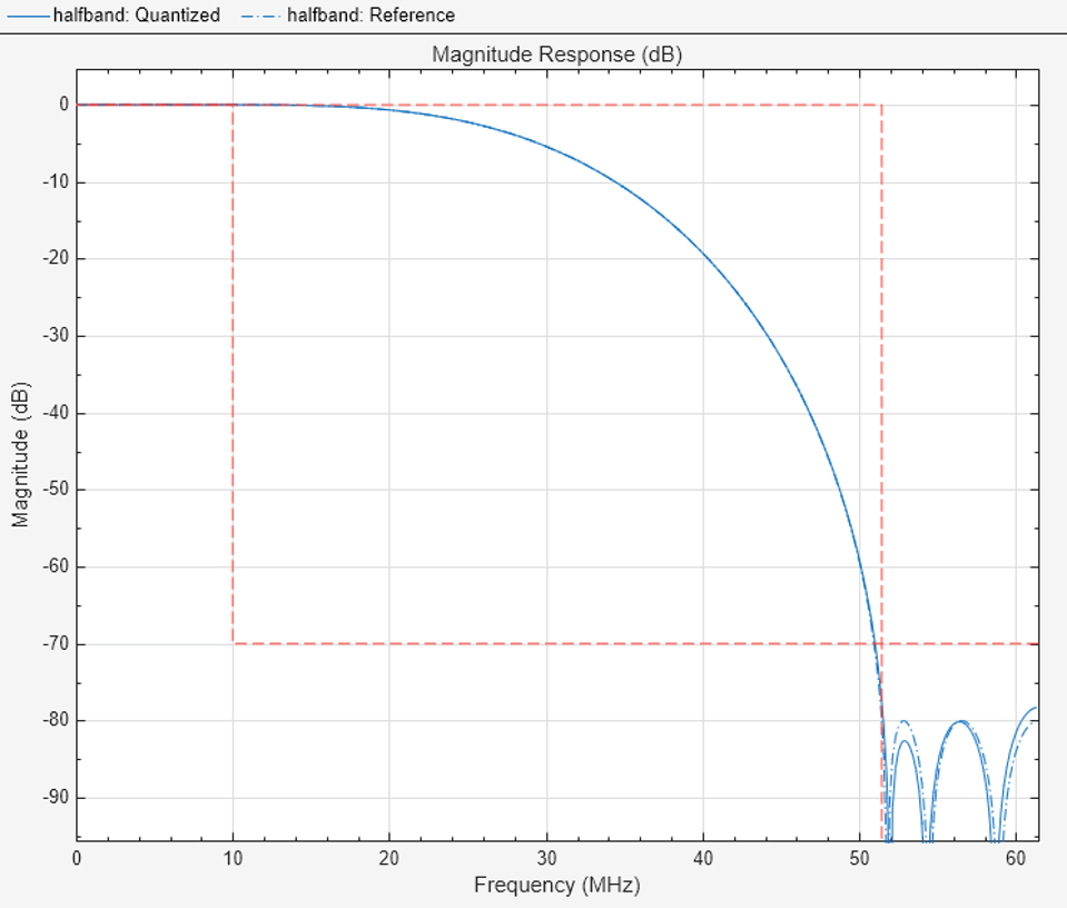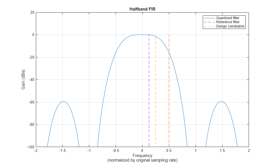 filterAnalyzer(halfband,'arithmetic','fixed'); SRCTestUtils.setPlotNameAndTitle('Halfband FIR'); legend('Quantized filter','Reference filter','Design constraints');