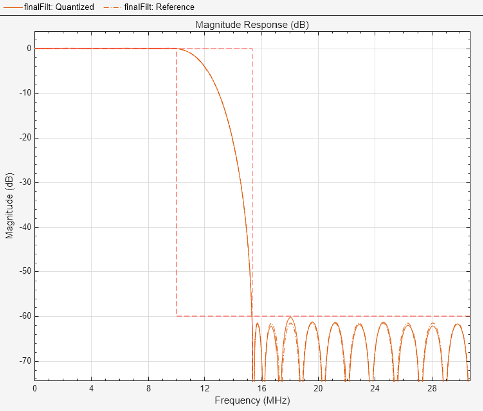 finalSpec = fdesign.decimator(2,'lowpass',... 'Fp,Fst,Ap,Ast',Fpass,Fstop,Ap,Ast,hbParams.FsOut); finalFilt = design(finalSpec,'equiripple','SystemObject',true); finalFilt.FullPrecisionOverride = false; finalFilt.CoefficientsDataType = 'Custom'; finalFilt.CustomCoefficientsDataType = numerictype([],... FIRCoeffsDT.WordLength,FIRCoeffsDT.FractionLength);
