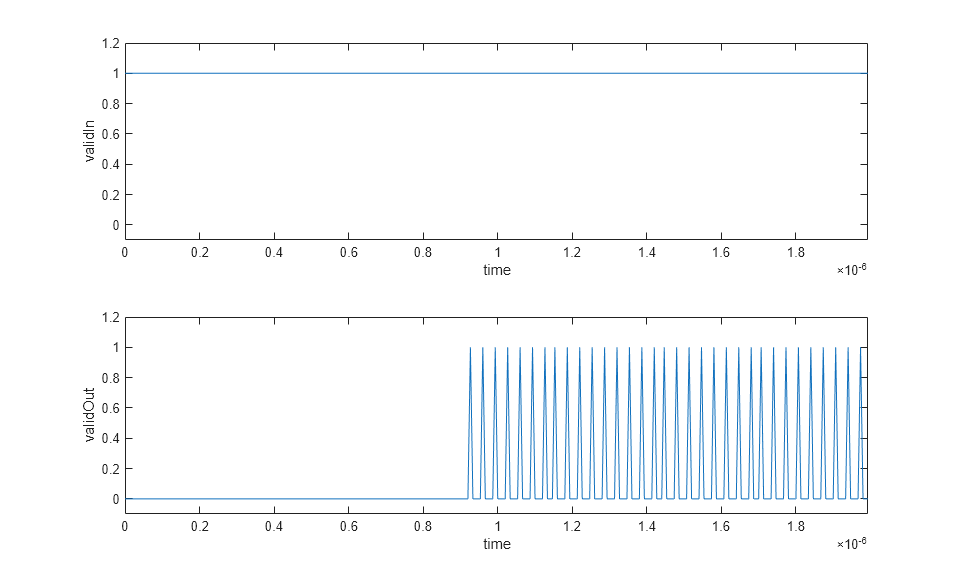 srcPlots.validSignals = figure; Ns = 300; validInSlice = validIn(1:Ns); validOutSlice = simOut.validOut(1:Ns); subplot(2,1,1); plot((0:Ns-1)/FsADC,validInSlice); axis([0 (Ns-1)/FsADC -0.1 1.2]); ylabel('validIn'); xlabel('time'); subplot(2,1,2); plot((0:Ns-1)/FsADC,validOutSlice); axis([0 (Ns-1)/FsADC -0.1 1.2]); ylabel('validOut'); xlabel('time');