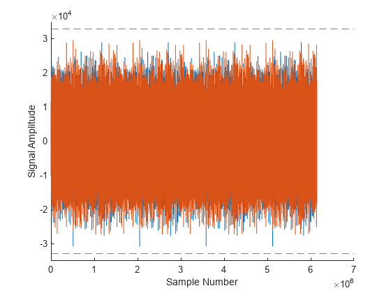 function plotData(data) figure(); hold on; ylim([-35000 35000]); plot(real(double(data))); plot(imag(double(data))); yline(intmin("int16"),"r--"); yline(intmax("int16"),"r--"); ylabel("Signal Amplitude"); xlabel("Sample Number"); end function [pow,peak] = calcPowerAndPeak(data) pow = pow2db(bandpower(double(data)./double(intmax("int16")))); peak = max(max(abs(real(data))),max(abs(imag(data)))); end