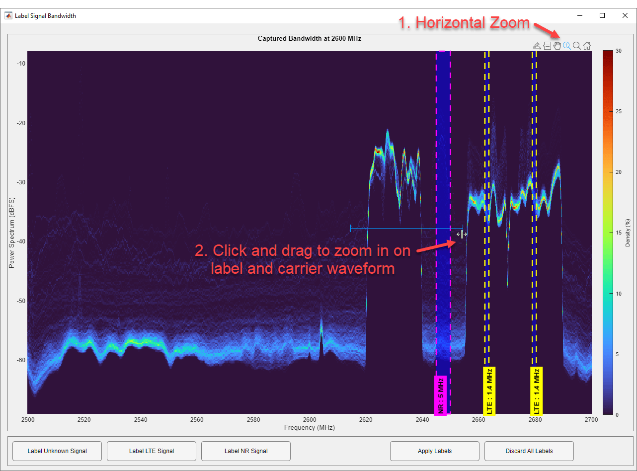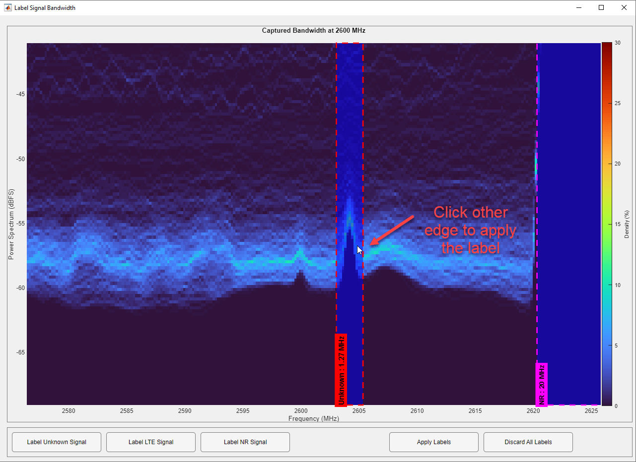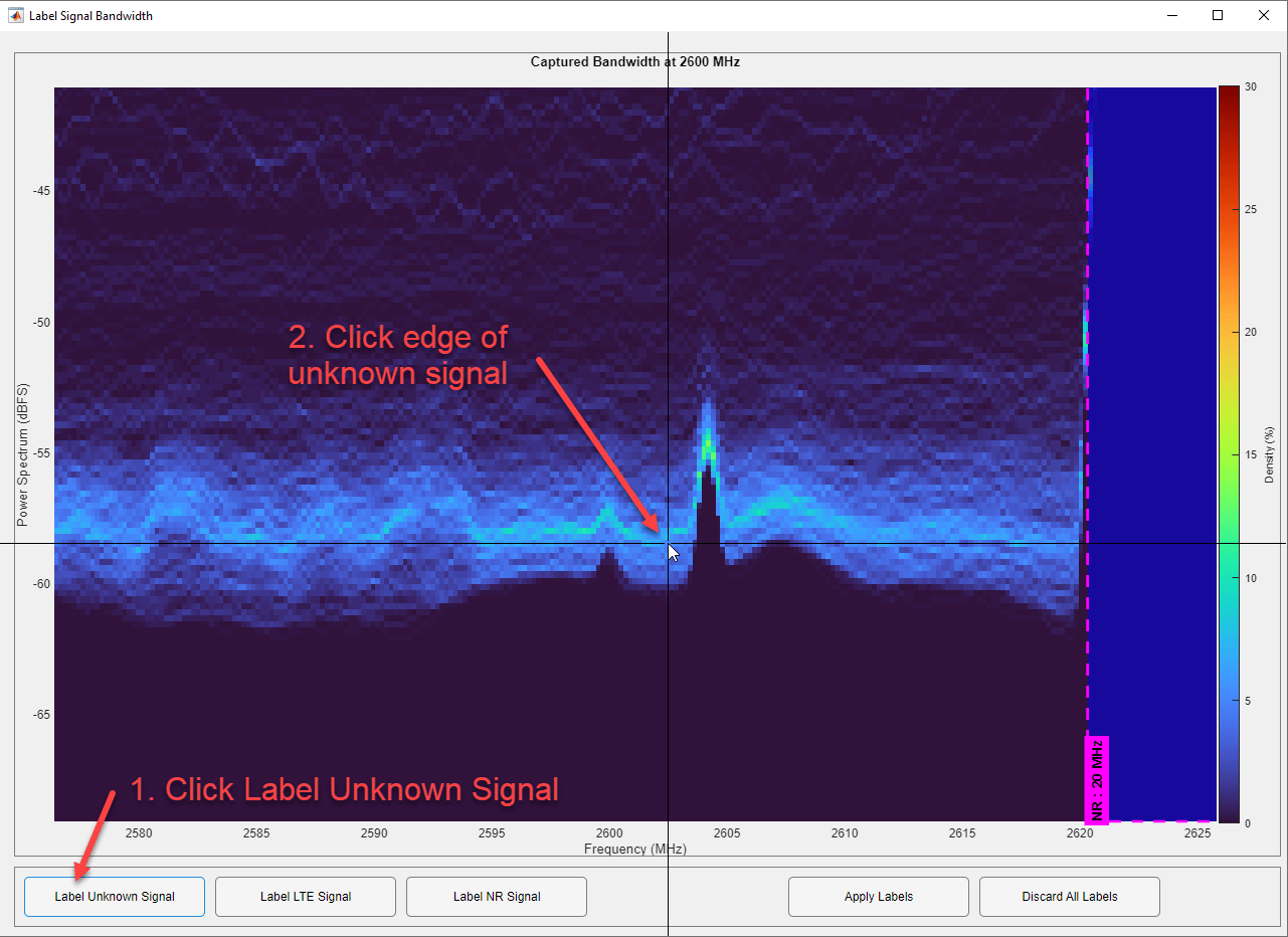 Finally, label any visible signals that are not NR or LTE as "Unknown". To do this, click the Label Unknown Signals button, then click on one edge of the unknown signal.