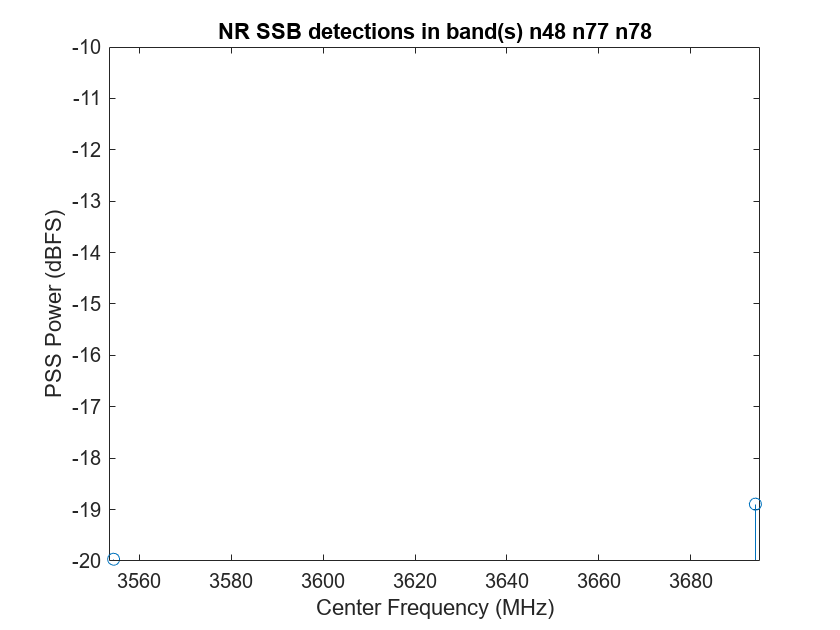 bands = unique(nrlteDetectionTable.Bands)'; for band = bands figure(); detectionsInBand = nrlteDetectionTable(nrlteDetectionTable.Bands==band,:); baseVal = floor(min(detectionsInBand.("PSS Power (dBFS)")/10))*10; s = stem(detectionsInBand,"Center Frequency (MHz)","PSS Power (dBFS)",BaseValue=baseVal); s.DataTipTemplate.DataTipRows(3)=dataTipTextRow("NID2",detectionsInBand.NID2'); type = extractAfter(extractBefore(detectionsInBand(1,:).("Detected Wireless Signal"),"PSS"),"h"); title(type+" PSS detections in band(s) "+band) axis([min(detectionsInBand.("Center Frequency (MHz)"))-1,max(detectionsInBand.("Center Frequency (MHz)"))+1,... baseVal, ceil(max(detectionsInBand.("PSS Power (dBFS)")/10))*10]); end