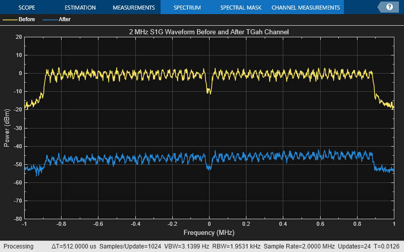 Path loss accounts for the roughly 50 dB of separation between the waveform before and after it passes through the TGah channel. The path loss results from the default transmitter-to-receiver distance of 3 meters, and from shadowing effects. The signal level variation shows the frequency selectivity of the delay profile across the frequency spectrum.