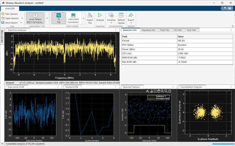 The Wireless Waveform Analyzer app enables you to blindly detect, decode, analyze an IEEE 802.11a™, IEEE 802.11n™, IEEE 802.11ac™, IEEE 802.11ax™, or IEEE® 802.11be™ packet in an imported waveform. Using this app, you can: