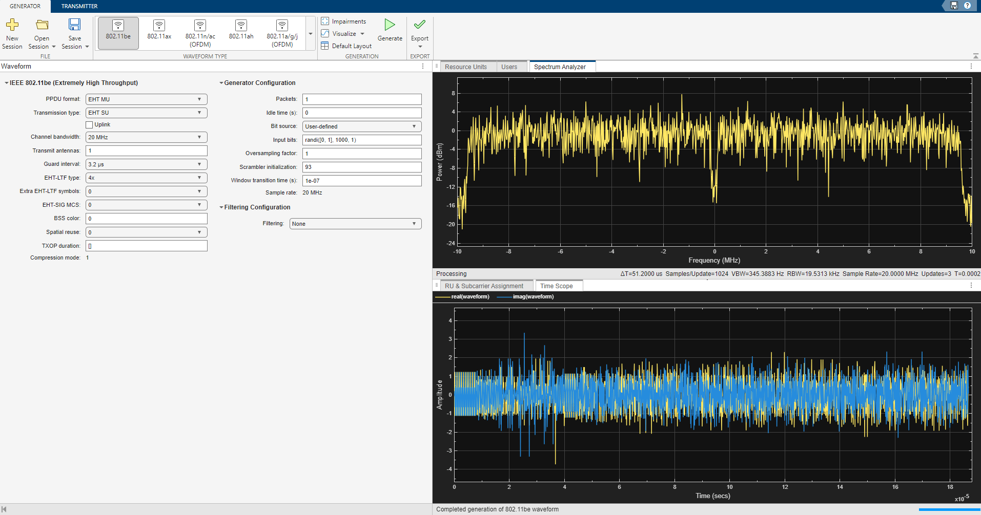 • Generate IEEE 802.11be™ waveforms, as specified in [3].
