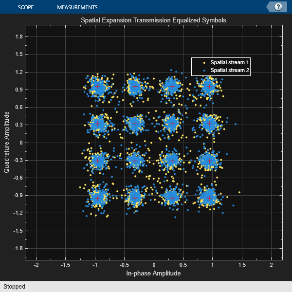 Plot the equalized constellation from the spatial expansion and beamformed transmissions for all spatial streams. Note the improved constellation using SVD-based transmit beamforming.