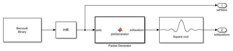 The baseband transmitter block creates a random PSDU and encodes the bits to create a single packet waveform based on the MCS and PSDU length values in the Model Parameters block. The packet generator block uses the function wlanWaveformGenerator to encode a packet.
