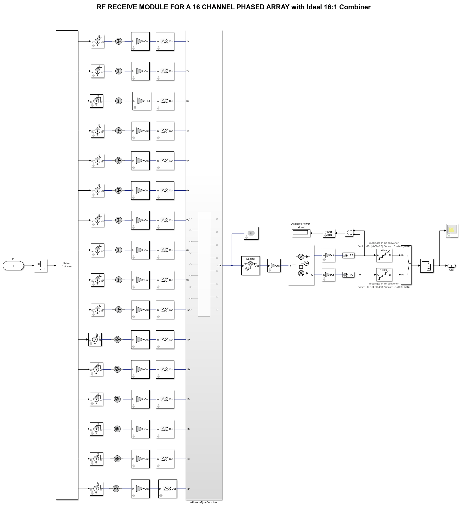 A 16 channel RF receiver module to process the RF signals. This receiver module includes low noise amplifiers, phase shifters, Wilkinson 16:1 combiner, and a down-converter. This module allows control of the beamforming direction used to calculate the corresponding phase shifts.