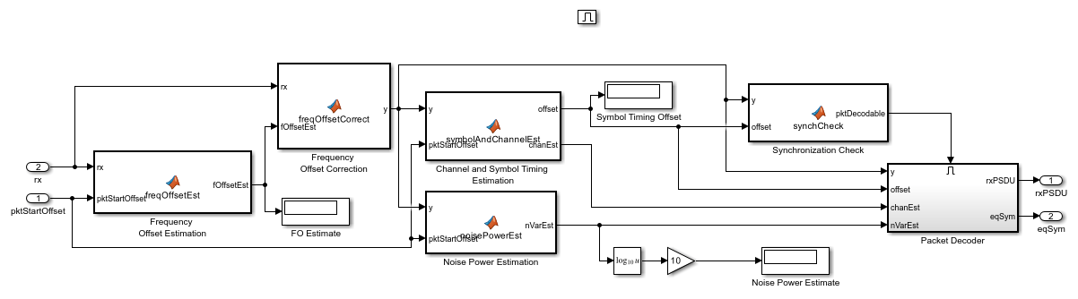 The MATLAB function block allows Simulink models to use MATLAB® functions. In this example, an 802.11ad SC link modeled in Simulink uses WLAN Toolbox functions called using MATLAB function blocks. For an 802.11ad baseband simulation in MATLAB, see the example 802.11ad Packet Error Rate Single Carrier PHY Simulation with TGay Channel.