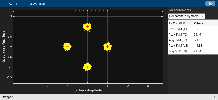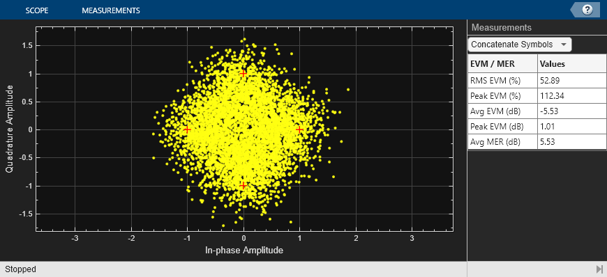 Running the simulation displays the packet error rate. The model updates the PER after processing each packet. The model also displays the equalized symbol constellation along with the EVM measurement. Note that for statistically valid results, long simulation times are required.