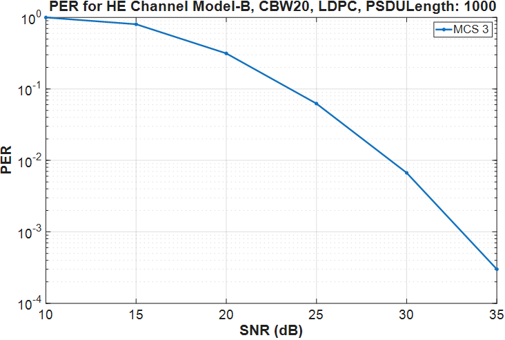 MCS 3, SNR 10 completed after 11 packets, PER:1 MCS 3, SNR 15 completed after 17 packets, PER:0.64706 MCS 3, SNR 20 completed after 51 packets, PER:0.21569 MCS 3, SNR 25 completed after 100 packets, PER:0.03 MCS 3, SNR 30 completed after 100 packets, PER:0 MCS 3, SNR 35 completed after 100 packets, PER:0