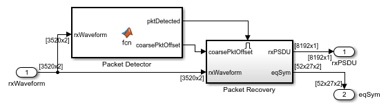 The wlanPacketDetect function is called within the Packet Detector block. If a packet is detected the Packet Recovery subsystem is enabled to process the detected packet.